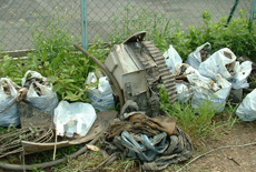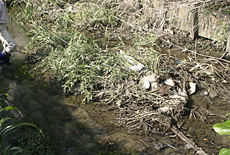 ゴミが堆積し流れの滞った川と回収したゴミ
