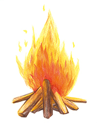 好きなものの欄に「焚き火」と書き続けて久しい。きっかけは小4の林間学校だ。大騒ぎの夕食が終わった後、クラス全員で広場に輪を作った。先生が真ん中に積まれた薪に点火すると、途端に辺りがしんと静まった。聞こえるのはパチパチと不規則に弾ける音だけ。ふと横を見ると隣の子もその奥の子も体育座りのまま真剣に炎を見つめていた。好きな子を巡って牽制しあったり、グループや仲間外れができたり。そんな日々に漂う緊張感は影を潜め、誰もが踊るようなオレンジの炎に照らされている。鼻筋や背中の柔らかい輪郭にはっとして、思わず泣きそうになった。