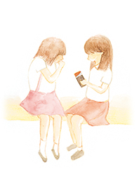 かよは父と子の二人暮し、私は8人家族、にぎやかな家庭にあこがれてか、かよは定期便のように毎日来た。勉強、お使い、台所の手伝い、時には銭湯も一緒、夏祭りの夜は揃いのゆかたで踊った。「私たち双子に見えるよね」と私の祖母や母にも甘え、すっかり、我が家にとけこんでいた。