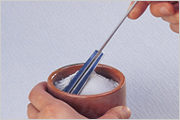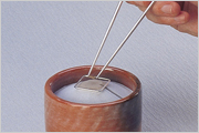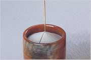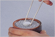 Once the surface of the charcoal has turned greyish, use the incense chopsticks to bury it in Mon-koh ash, in the Mon-koh burner.