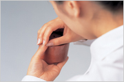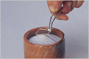 With your left hand, gently pick up the Mon-koh burner, being careful to hold burner level (to avoid disturbing the mica plate). With your right hand, make a small "chimney" atop the burner. Gently smell the fragrance emanating from the opening of your right hand.