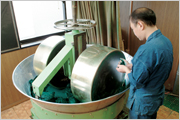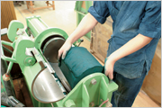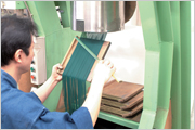A hydraulic extruding machine compresses the cylindrical "dough" through the small holes of the steel mold, called "Sugane," into the form of long strands similar to a spaghetti noodle. A board, called "Bon-ita" catches the soft strands of incense. Both ends of the stick incense are trimmed by hand with a bamboo knife.