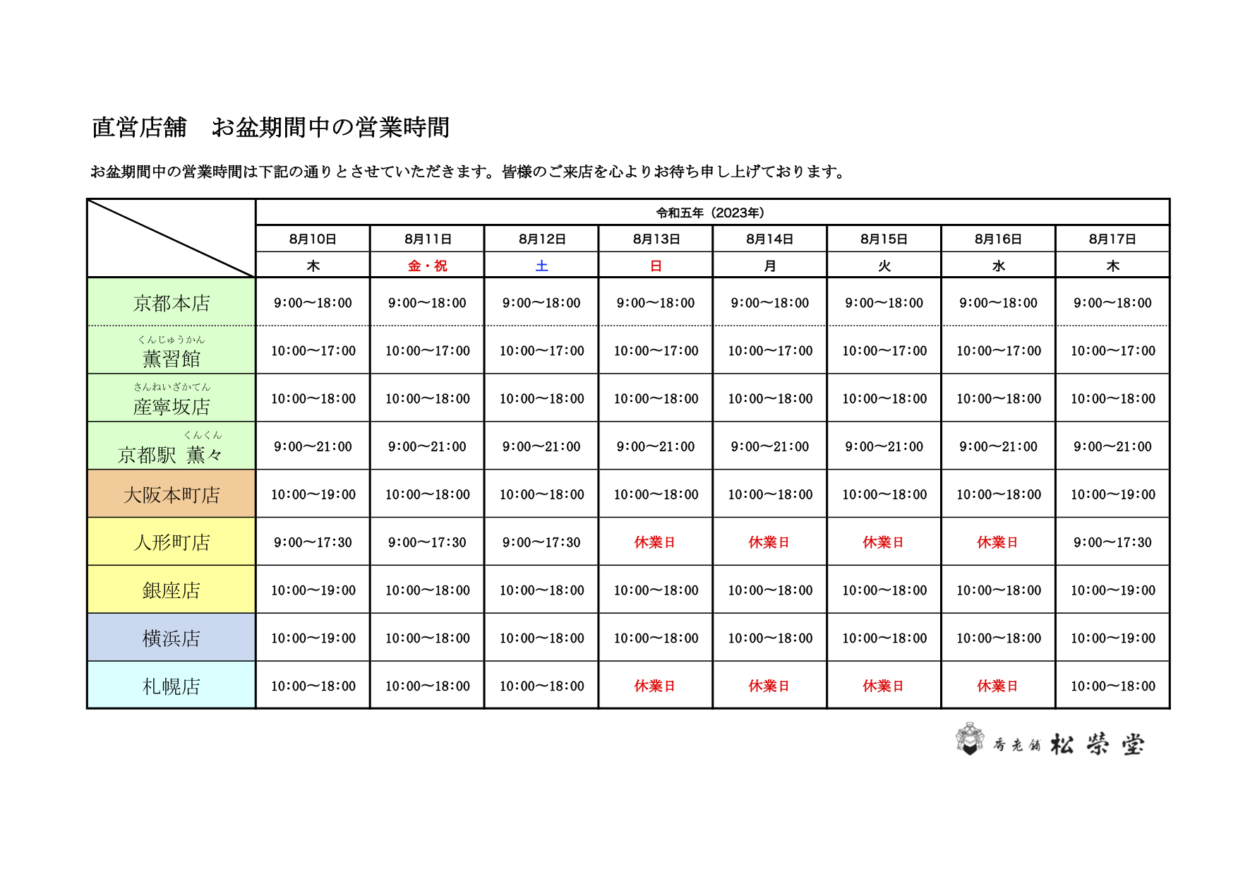 お盆期間(2023年8月10日〜17日)の各直営店舗の営業時間は下記のPDFファイルをご覧くださいませ。