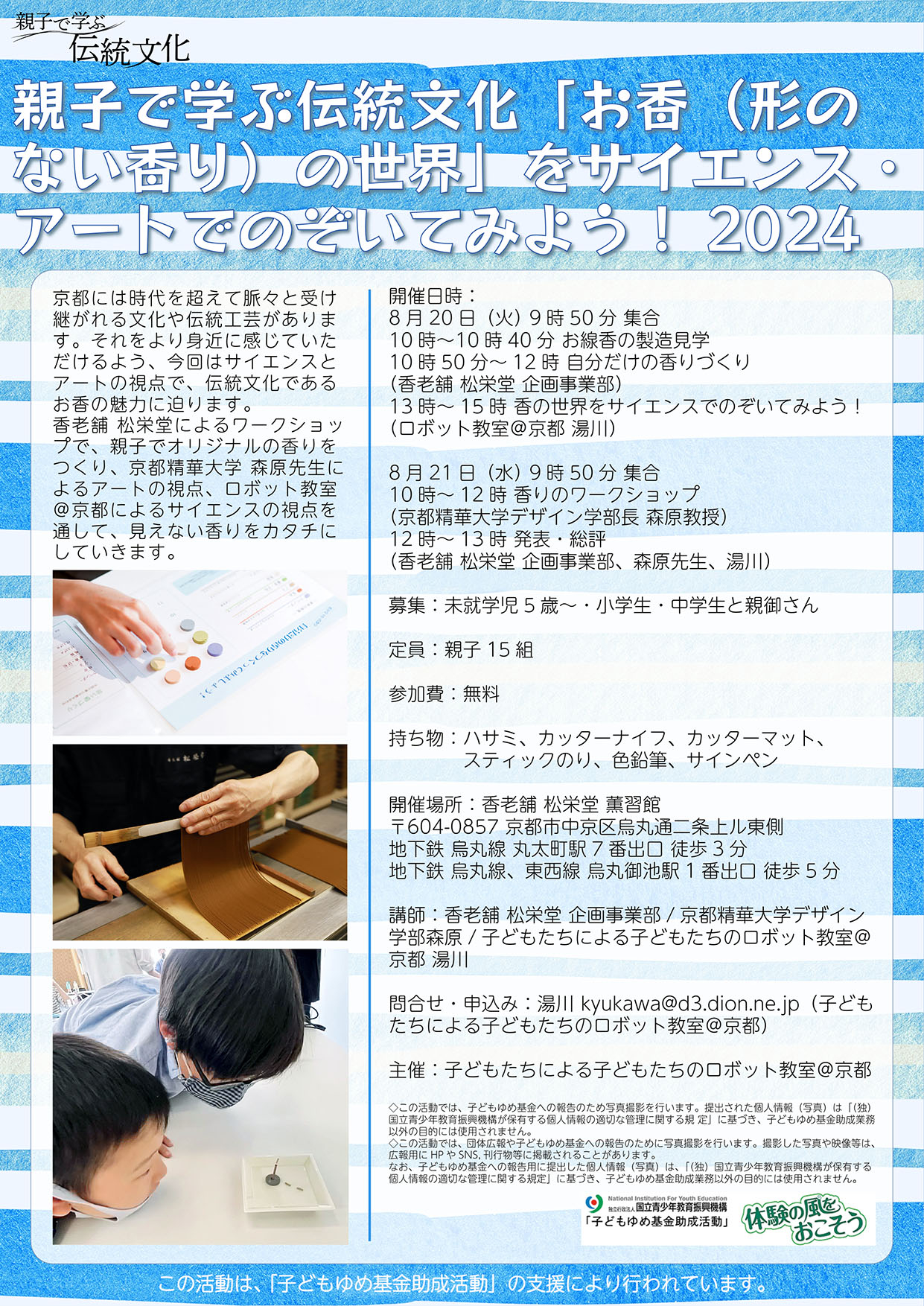 京都には時代を超えて脈々と受け継がれれる文化や伝統工芸があります。それをより身近に感じていただけるよう、サイエンスとアートの視点で、お香の魅力に迫ります。松栄堂によるワークショップで、親子でオリジナルの香りの匂い香をつくり、京都精華大学 森原先生によるアートの視点、ロボット教室@京都によるサイエンスの視点をとして、見えない香りをカタチにしていきます。