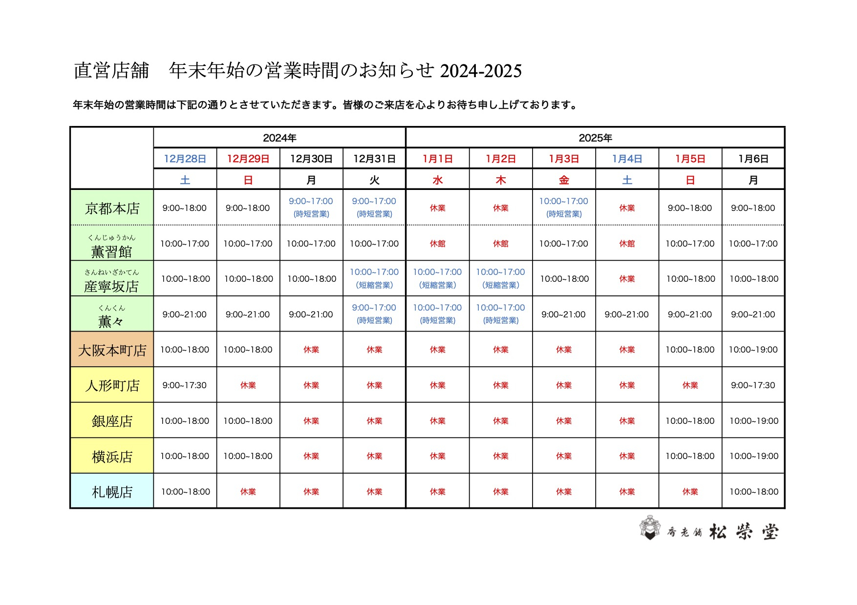 年末年始、各直営店舗は下記の通り営業させていただきます。